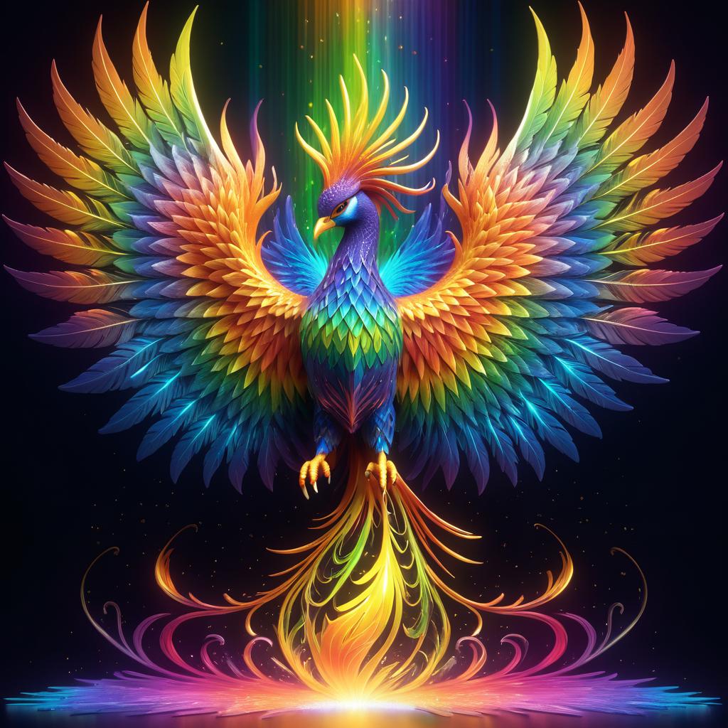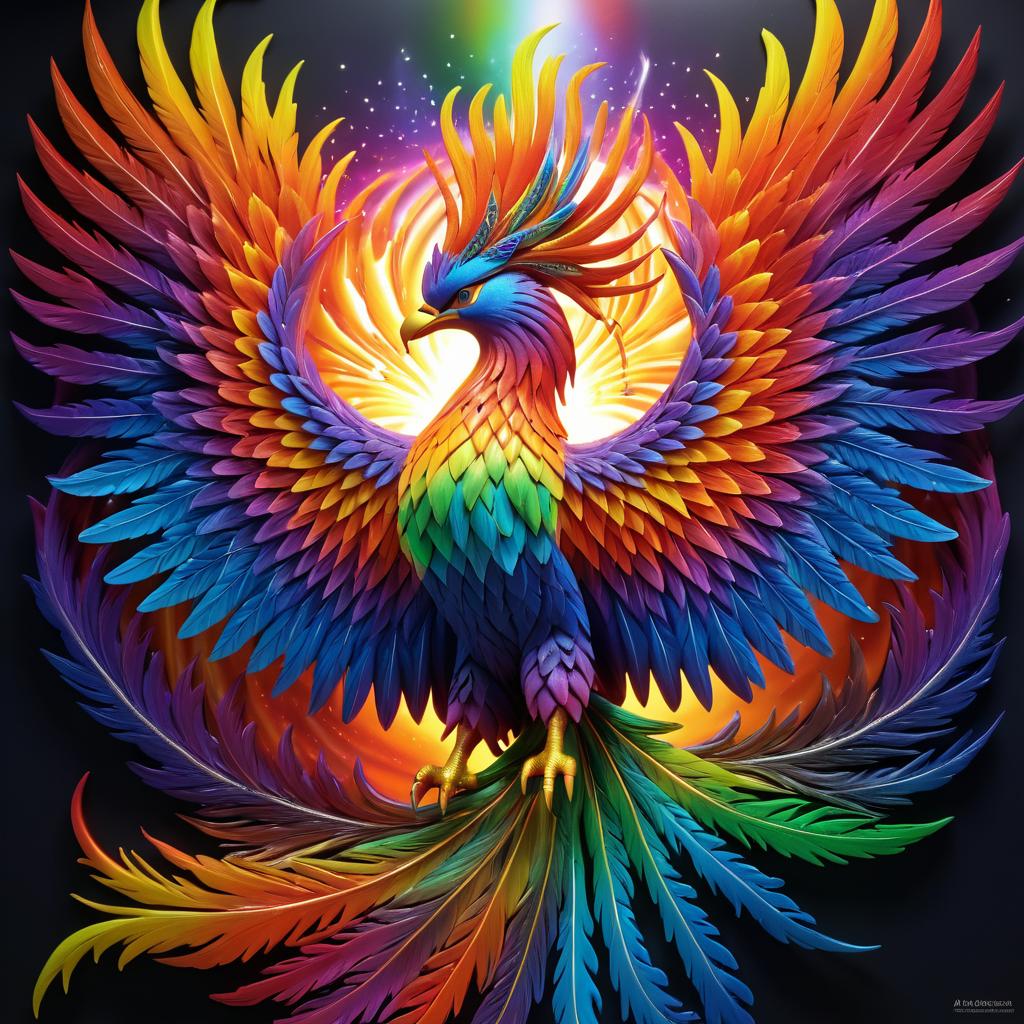 Ultra-realistic digital painting of a majestic phoenix displaying vibrant, intricately detailed feathers in a full spectrum of rainbow colors. The bird is symmetrical with volumetric lighting effects emphasizing its fiery and ethereal appearance. Featuring a sharp yellow beak and clawed feet, this phoenix is rendered with stunning detail and vivid colors on a dark background, inspired by mythical firebirds and fantasy art.