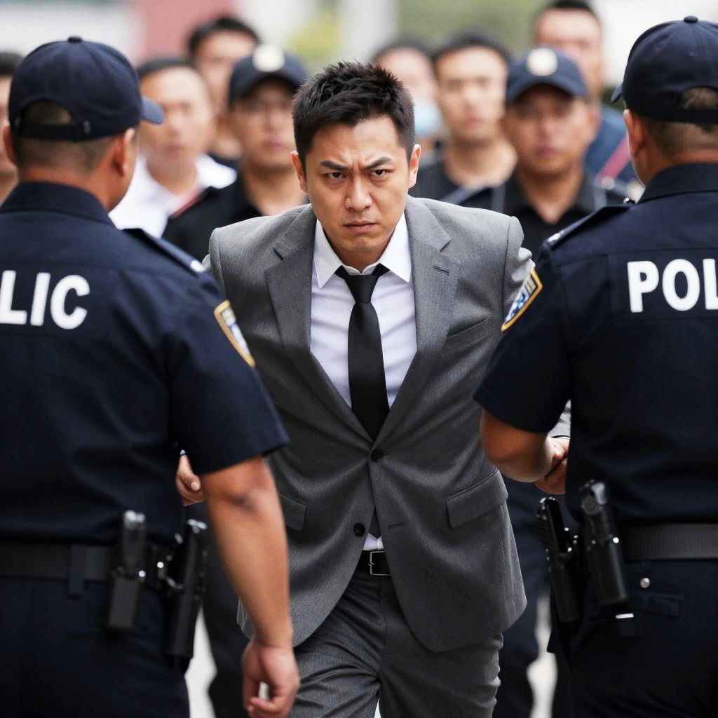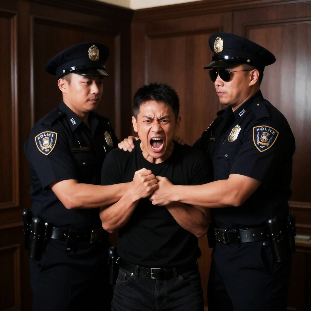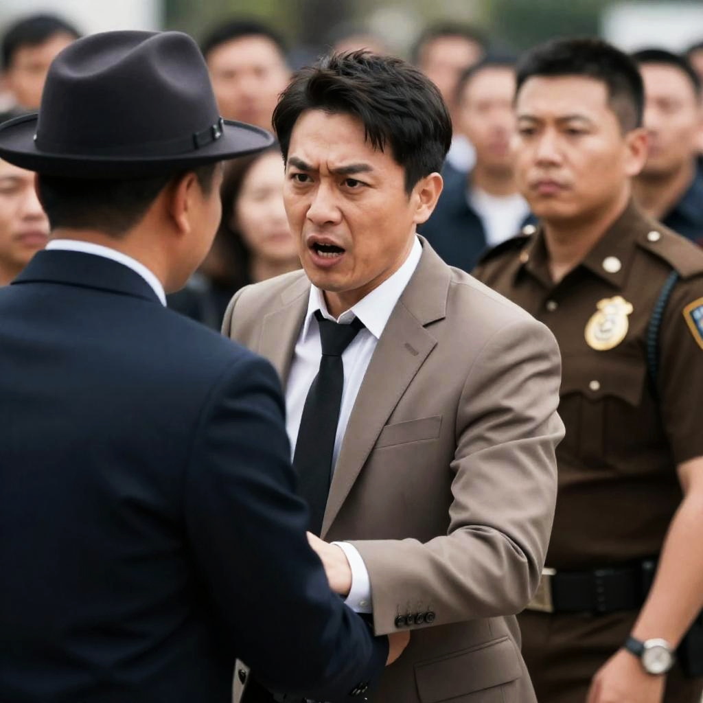Photograph of a man with dark hair, gray suit, and tie, being pushed by a man in a beige hat and dark vest. A police officer in a brown uniform with a badge stands to the right. Crowded background with multiple people. Man's mouth open in a yell. Intense expressions.