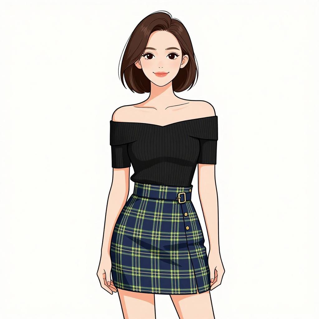 Woman with pretty face and pretty hair. smiling Woman, chic, black off-the-shoulder ribbed top, short sleeves, high-waisted plaid mini skirt in navy blue with green and yellow lines, pleated detail, side buckle fastenings. --sref 1467