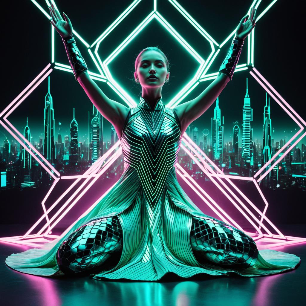 A futuristic fashion portrait of a figure donned in luminous fiber-optic gown intertwining hexagonal motifs, with iridescent shimmer with gradient silver to aqua eyeliner, posed in a graceful seated pose with arms extended upward. The lighting is high contrast, emphasizing the glossy surfaces and detailed textures of the clothing. The background features a futuristic cityscape illuminated by pastel pink and green neon overlays, creating a cinematic and surreal atmosphere.