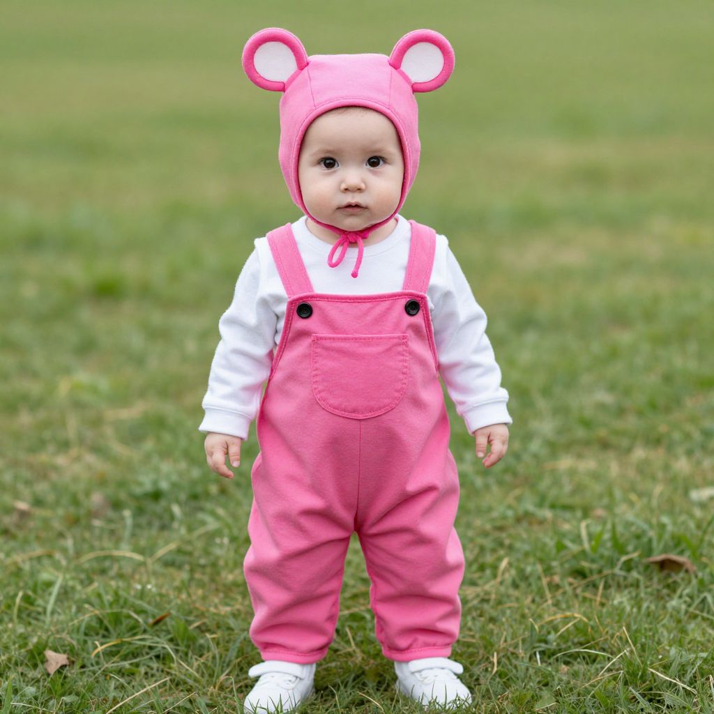 Rag Doll Costume Infant, baby standing in the grass wearing a pink overall