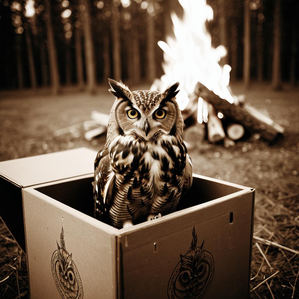 High-resolution image of a majestic owl inside a box near a bonfire, pinhole camera effect, soft focus, classic look, sepia tones, shallow depth of field