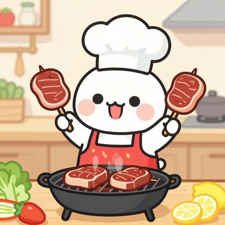 Cute cartoon chef in a white hat and red apron joyfully holds two sizzling steaks on wooden skewers above a grill, surrounded by fresh vegetables and lemon slices on a wooden countertop in a cozy kitchen setting.