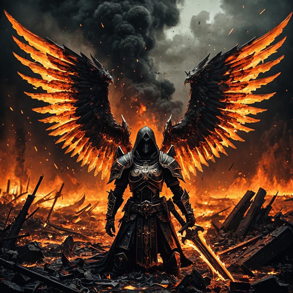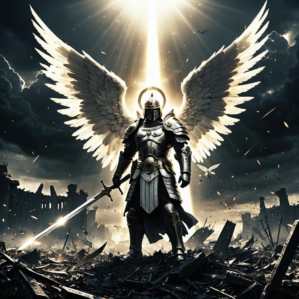 A towering angelic warrior, with radiant halo and ethereal wings made of light, towering over a battlefield strewn with remnants of ancient wars, rendered in the dramatic and apocalyptic style of Hideaki Anno.
