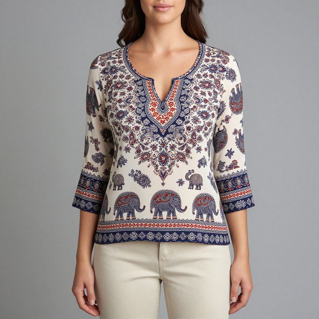"Woman, casual, cream-colored blouse with a navy and red paisley and elephant print, scoop neckline with a notch detail, three-quarter length sleeves, border print at cuffs and hemline, paired with light beige skinny pants.. Sexy. Pretty face and beаutiful eyes. Big breasts."