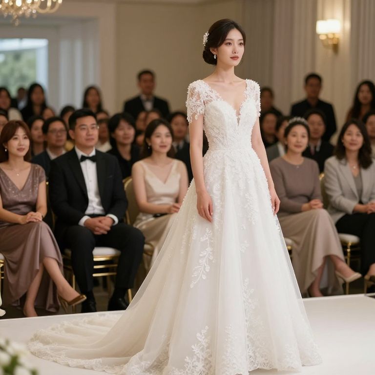 Wedding Rehearsal Dress, bride in a white wedding dress standing in front of a crowd