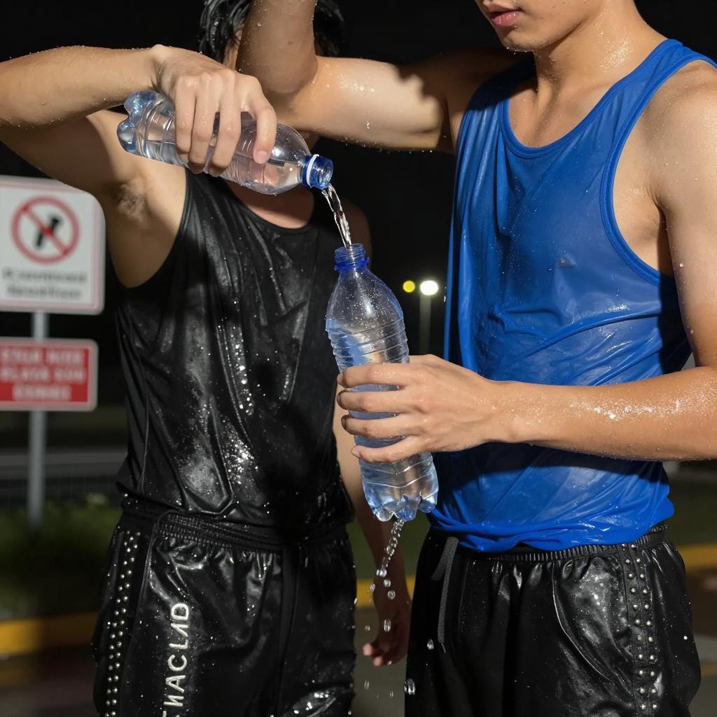 Two people with wet skin, wearing black and blue wet tank tops, and black studded pants. Water pours from a clear plastic bottle onto the blue top. Background includes blurred signs and lights. The person on the right holds the bottle. Both have visible midriffs. One person's arm is raised, while the other's arm is bent.