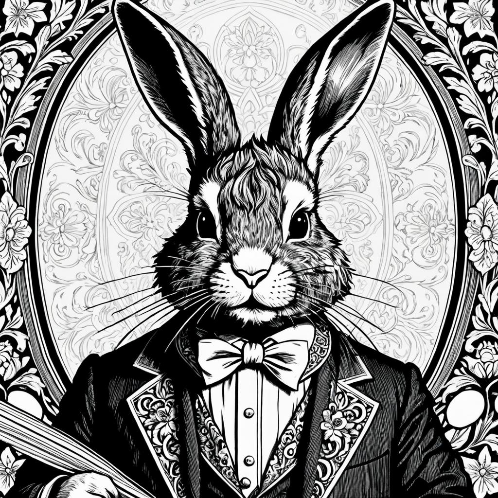 Black and white detailed illustration of a rabbit dressed in an ornate tuxedo with a bow tie, set against an intricate floral and oval patterned background. The artwork features hyper-realistic and elegant marker art style with highly detailed fur and clothing textures.