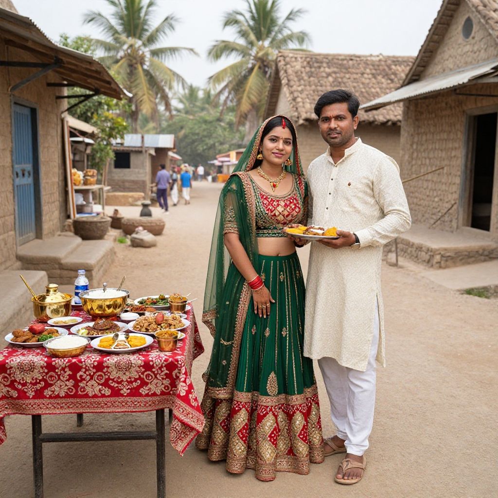 An Indian couple dressed in traditional attire stand in a village street with various traditional Indian dishes displayed on a table nearby. The woman wears a green and red lehenga and the man holds a plate of food. The background features rustic village houses and palm trees.
