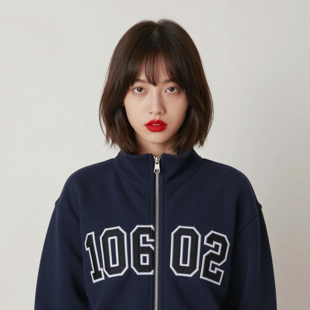 Photograph of a young woman with pale skin and short, dark brown hair with bangs. She wears a dark blue, zip-up jacket with large, black, bold numbers "10602" across the chest. Her lips are painted bright red. She stands against a plain, light-colored background, looking directly at the camera with a neutral expression.
