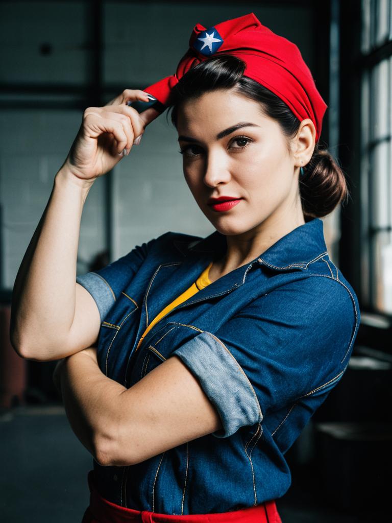 Woman in Rosie Riveter costume, photorealistic cosplay photography, cinematic realism