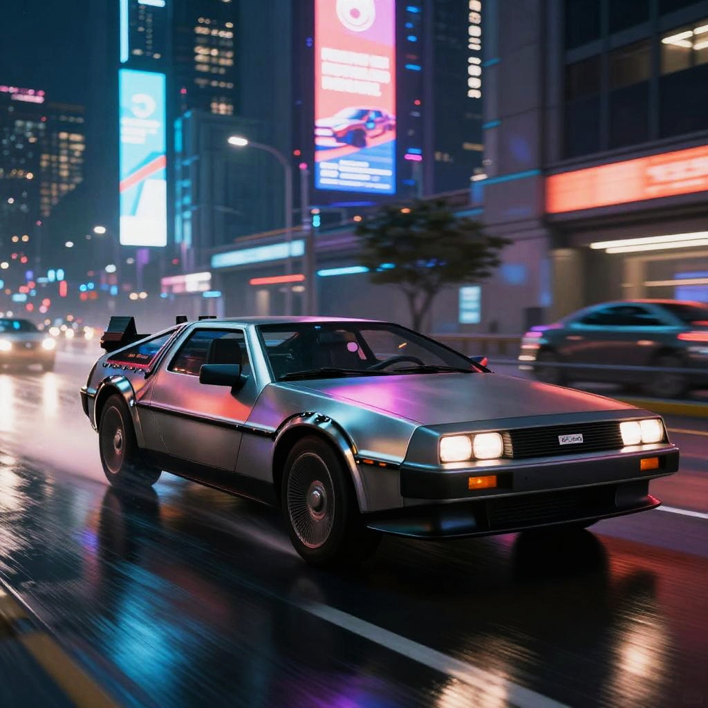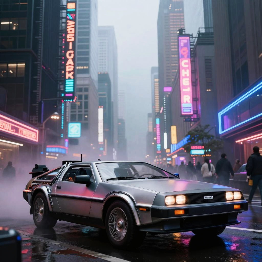 A cyberpunk DeLorean in a dystopian city market, surrounded by augmented humans and flying drones, neon graffiti-covered walls and holograms illuminating its metallic frame, moody cyberpunk vibe