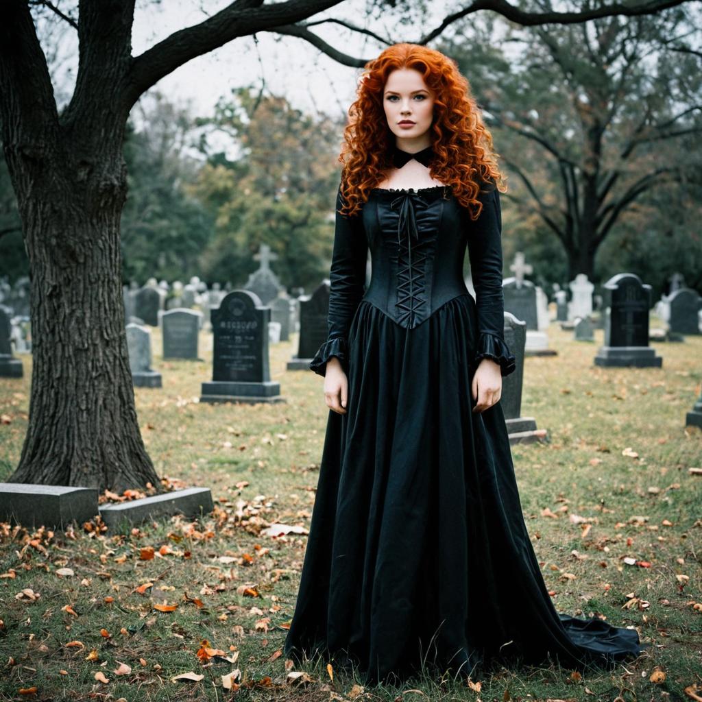 Female tombstone costume ,1girl, solo, long hair, dress, tombstone, graveyard, looking at viewer, outdoors, tree, realistic, black dress, red hair, curly hair, standing, closed mouth, long sleeves, orange hair