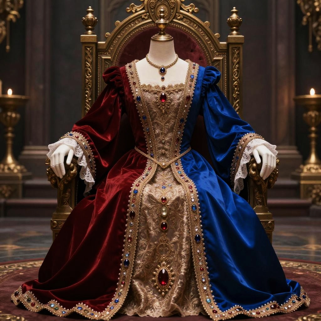 DND noble clothes featuring intricate embroidery and luxurious fabrics, a blend of velvet and silk, detailed gold and silver threadwork, set in a medieval fantasy court with elegant jewelry, flowing capes, and polished leather boots, dramatic lighting