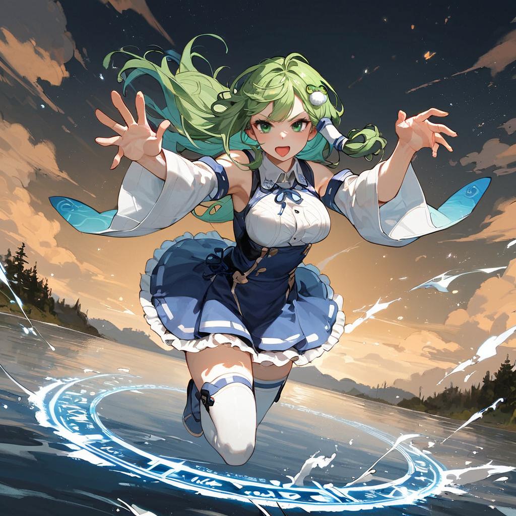 Score_9, score_8_up, score_7_up, score_6_up, score_5_up, score_4_up, source_anime, rating_safe, kochiya sanae, 1girl, green hair, long hair, green eyes, medium breasts, frog hair ornament, hair tubes, snake hair ornament, collared shirt, white shirt, detached sleeves, wide sleeves, blue skirt, frilled skirt, thighhighs, dutch angle, from above, floating hair, floating, outstretched arm, glaring, open mouth, fighting, danmaku, aura, wind, splashing, magic circle, hexagram, star \(symbol\), forest, sunset, fog, lake, gradient sky, cloud