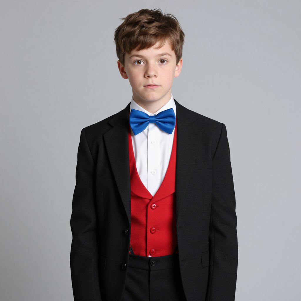Charlie bucket fancy dress, 1boy, male focus, solo, bow, bowtie, vest, shirt, blue bow, realistic, red vest, blue bowtie, jacket, brown hair, looking at viewer, white shirt, grey background, black jacket, closed mouth, simple background, suspenders, collared shirt, suit, pants