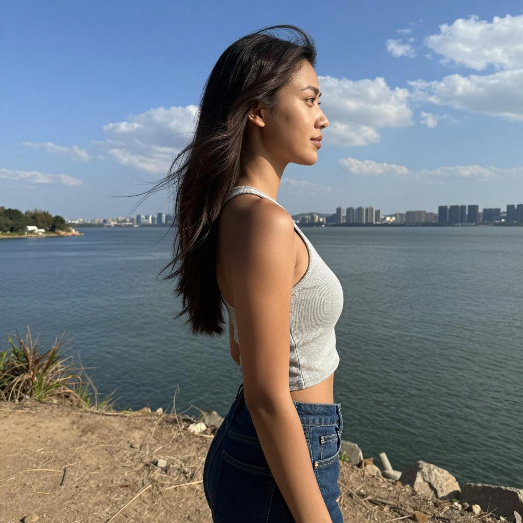 Photograph of a woman with light brown skin and long dark hair, standing on a cliffside, facing right. She wears a gray crop top and dark blue jeans. Large blue lake in the background with a city skyline and scattered clouds in the distance. Sunlight illuminates her profile.