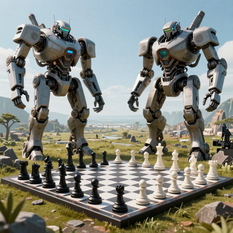 Photorealistic CGI image showing two white and black robotic mechs standing on opposite sides of a chessboard in an outdoor grassy field. The mechs have glowing blue and green eyes, and intricate metallic armor with jointed limbs. The chessboard, featuring black and white pieces, is centrally placed on the grass. In the background, there are distant trees, small houses, and a clear blue sky. The mechs' design is futuristic, with detailed textures and light reflections, contrasting against the natural setting. The scene combines elements of science fiction and a classic game of chess in a serene landscape.