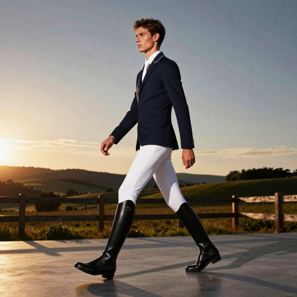 A high-end editorial photograph of elegant equestrian rider striding a couture runway in sunset countryside field with rolling hills and a wooden fence, wearing tailored navy riding jacket, white breeches, and polished black riding boots. Strong key light from the left casts crisp highlights and a dark-to-light gray gradient across a minimalist backdrop; full-body framing, clean shadows, reflective floor, ultra-detailed textures, futuristic yet elegant mood, minimal props, balanced color, high contrast, magazine-cover energy.