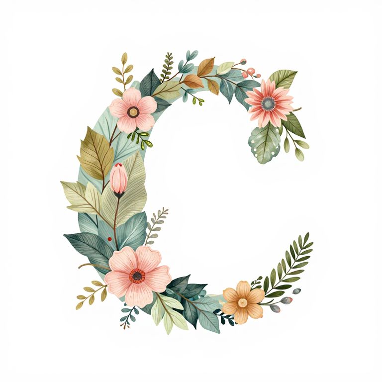 Extreme Close-Up Shot Of Style Inspired Clothing On The Style Inspired Clothing, white background::3, A capital letter C::3, typography, vines, leaves, pastel colors, intricate, vector, floral,