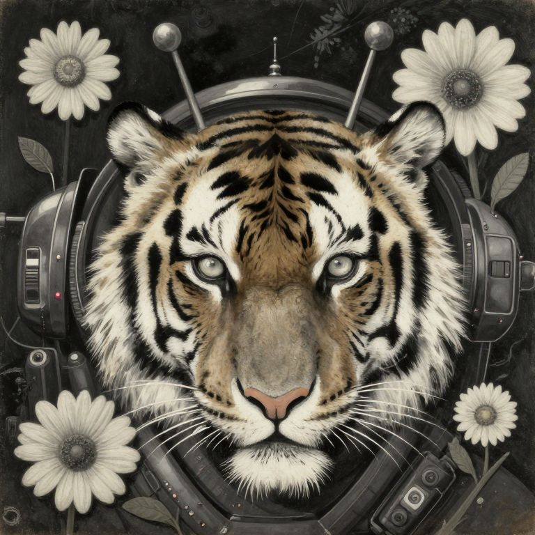 Digital art of a tiger's face surrounded by white flowers and mechanical gears, featuring realistic fur textures and intense eyes.