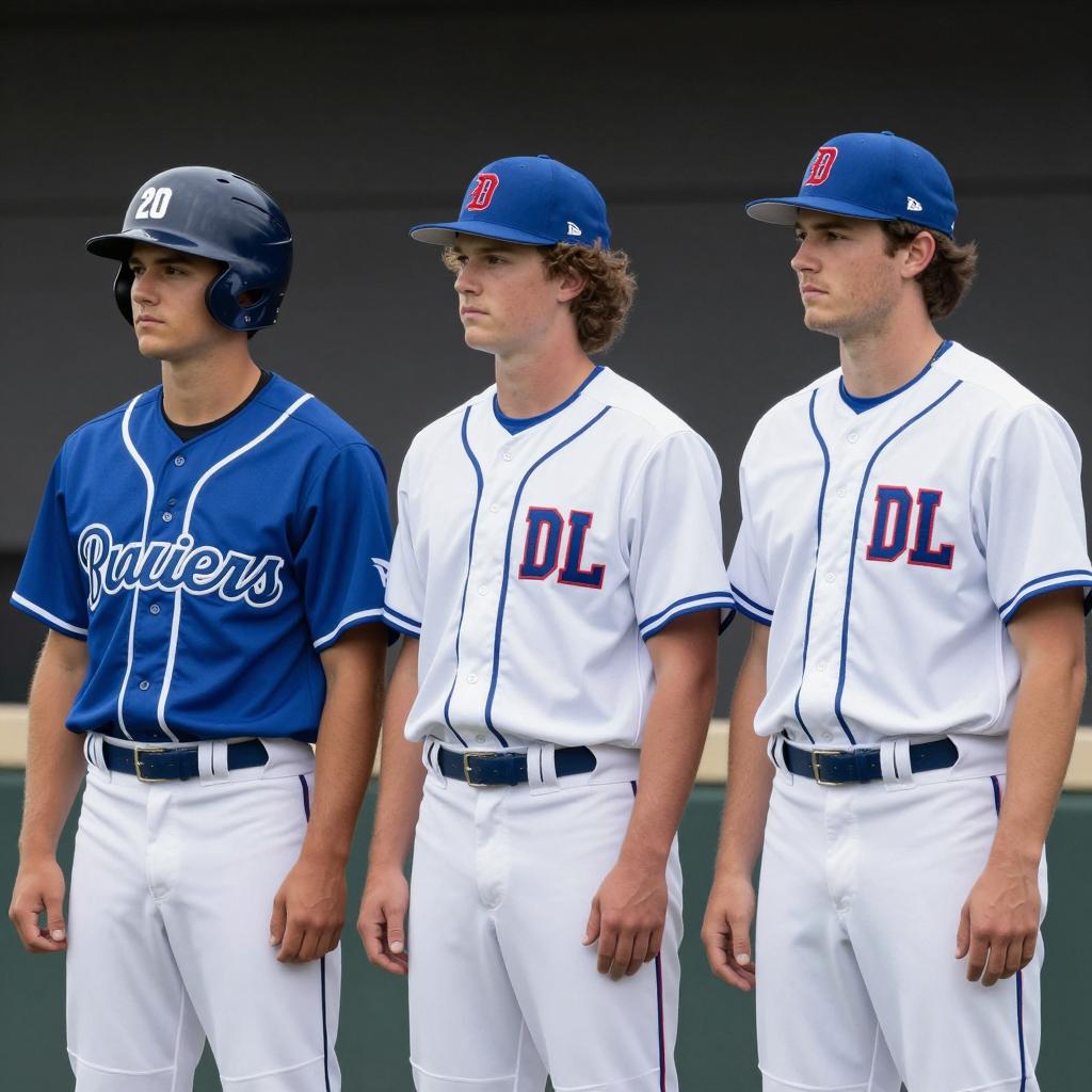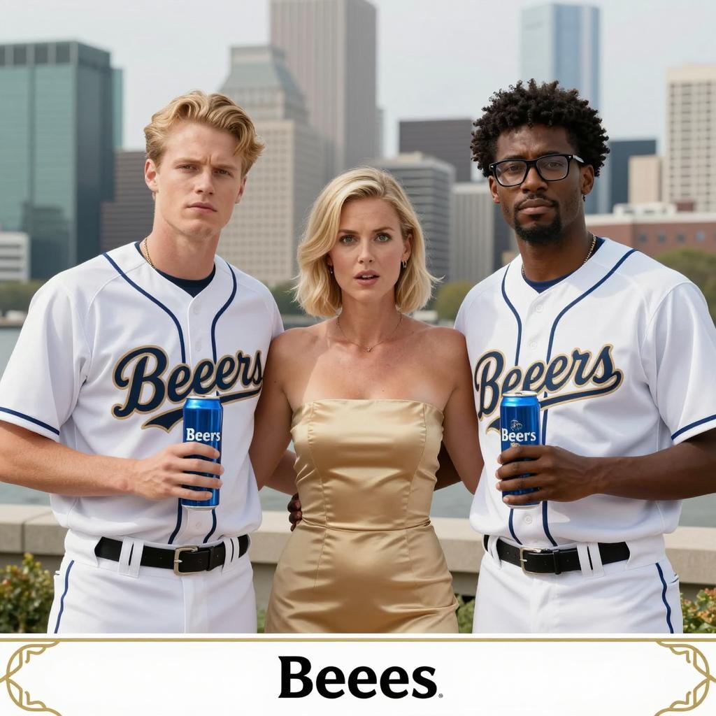 Four young men in a locker room. Three wear white baseball uniforms with "Bees" in red and blue, one with number 4, one with number 1. One man with blond hair and number 4 jersey kneels holding a baseball, looking serious. Man with curly brown hair and glasses, number 1 jersey, stands with hands on hips, smiling. Two other men sit on blue benches, wearing similar uniforms, looking relaxed. Red post, white wall, blue lower wall, map, and bulletin board in background.