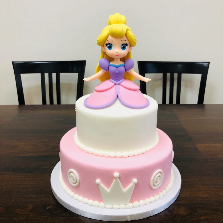 This is a colorful photo of a two-tiered cake shaped like a princess with a blonde bun and blue eyes. The top tier is white with a pink-purple skirt, and the bottom tier is pink with white swirls and a white crown symbol. The princess figure stands in the center with arms outstretched. The cake sits on a dark wooden table with two black chairs in the background.