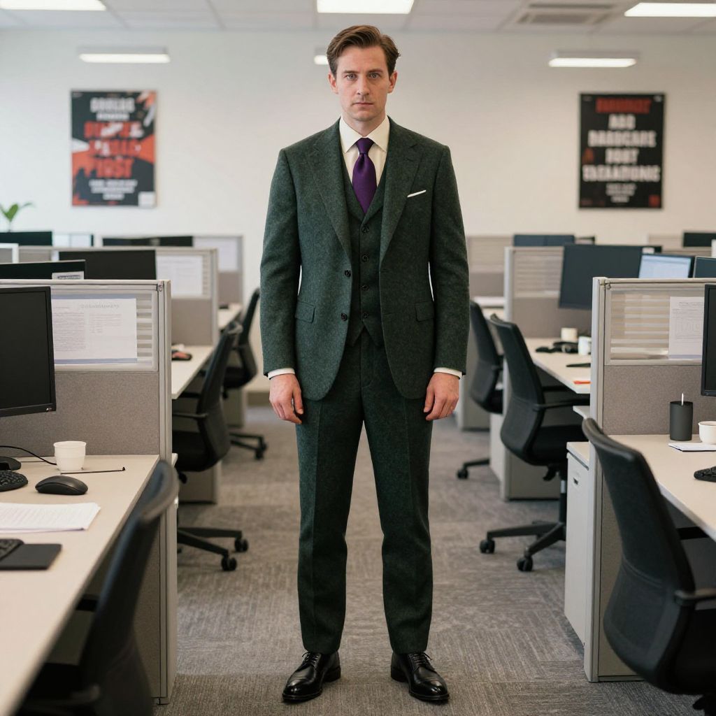 A man, dark green wool three-piece suit, ivory dress shirt, deep purple silk tie, black leather derby shoes, standing in a bright open office space, cubicles with computer screens, motivational posters on walls, lithographic film style, confident expression Man has masculine face and piercing eyes