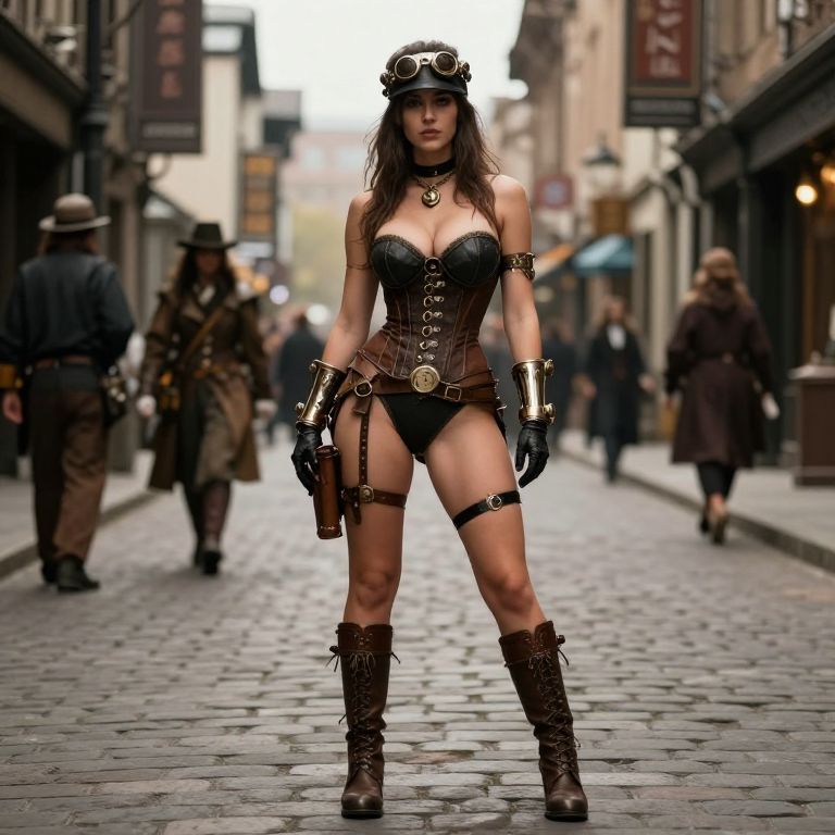 Highlight steampunk girl, big cheast, full body, very little clothes, steampunk street, realistic photo,