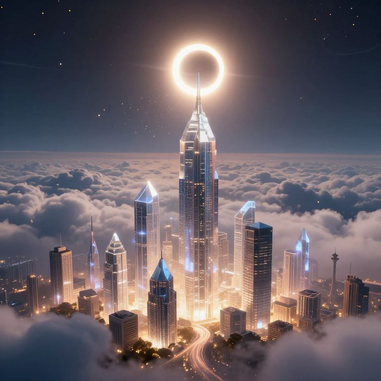 A digitally rendered, surreal cityscape features a cluster of illuminated skyscrapers with glowing blue-tipped roofs, rising from a sea of white, fluffy clouds. The tallest building, centrally positioned, has a radiant, glowing sun halo at its peak, casting a bright, golden light over the city. The sky above is a deep, starry blue, dotted with small stars. The city's streets below are visible as winding, glowing pathways. The overall scene combines elements of fantasy and realism, creating an ethereal, otherworldly atmosphere.