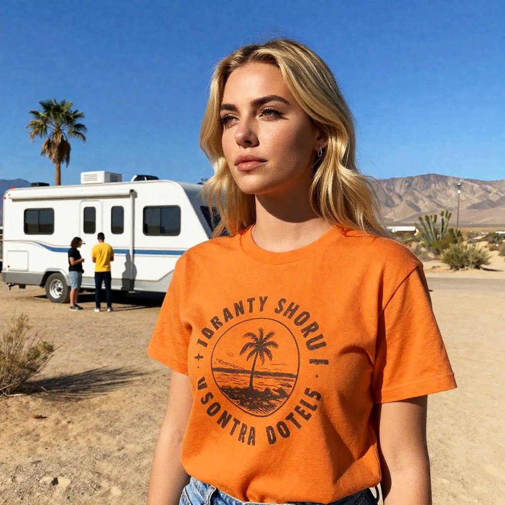 Blonde woman with shoulder-length hair in orange t-shirt with graphic print stands in desert, looking slightly to the side. Background includes white RV, two people near RV, palm tree, distant mountains, and sparse desert vegetation. Clear blue sky. Woman's expression is neutral. Two people in background are partially visible, one wearing yellow shirt. Desert landscape dominates scene.
