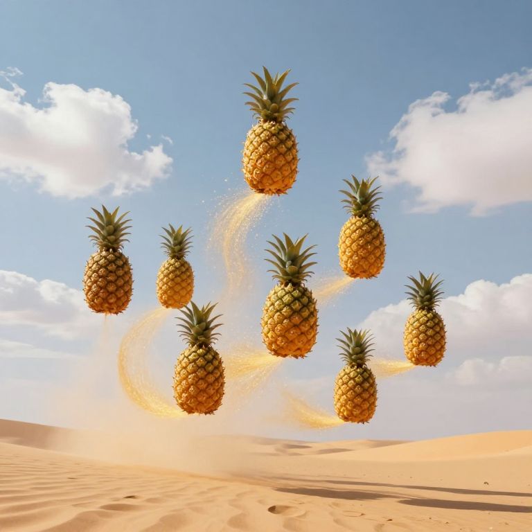 Glistening golden ribbons trail behind six vibrant pineapples as they soar gracefully through a dreamy desert landscape, their flight leaving a shimmering path against the backdrop of a serene, cloud-dotted sky.
