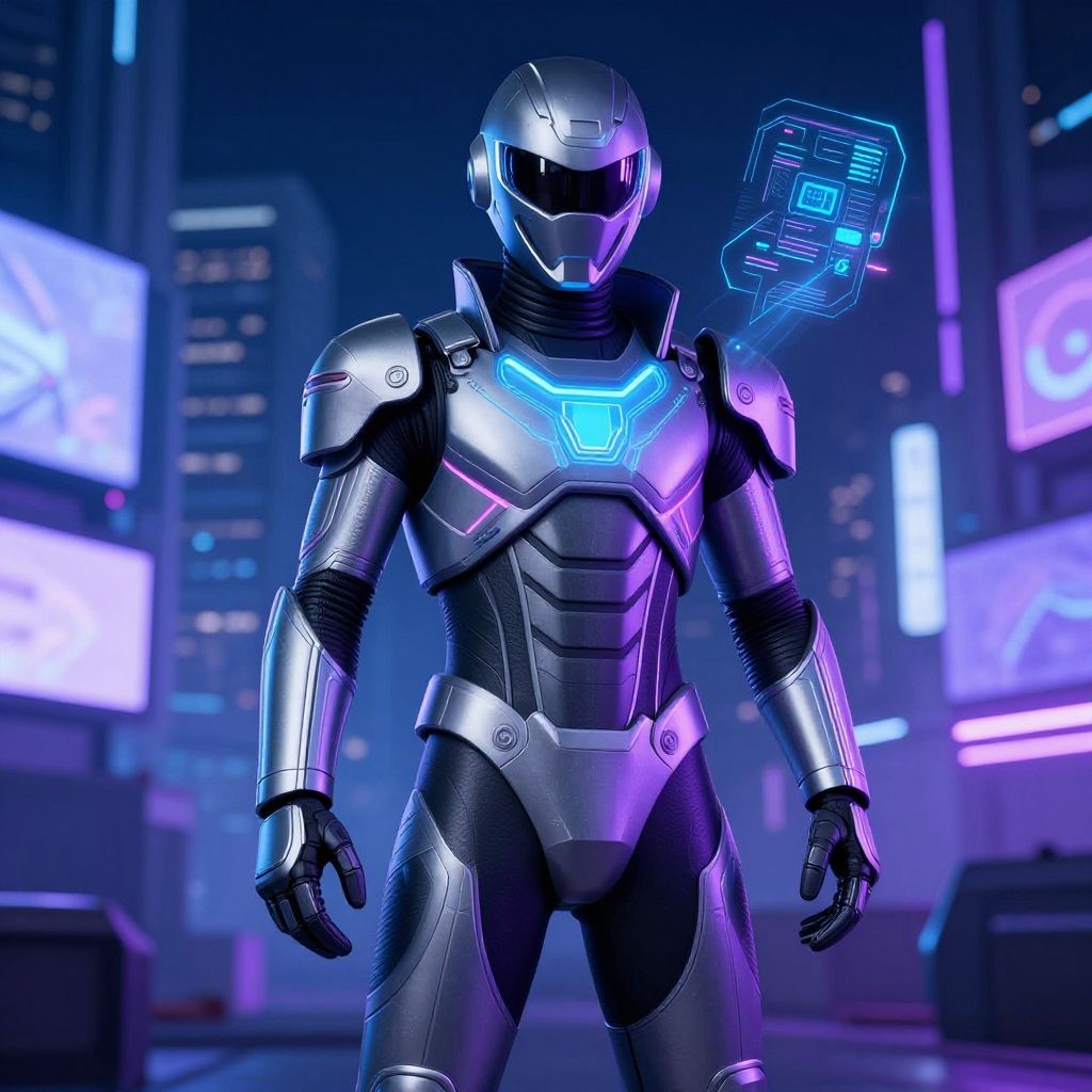 A digitally rendered image of a futuristic, armored humanoid robot standing in a neon-lit urban environment. The robot has a sleek, silver helmet with a black visor, and its armor is highlighted with bright blue and purple neon accents. A glowing blue holographic interface floats near its right shoulder. The background features blurred, towering buildings with illuminated screens. The robot's body is detailed with metallic textures and segmented armor plates. The overall color palette includes blues, purples, and blacks, creating a cyberpunk aesthetic.