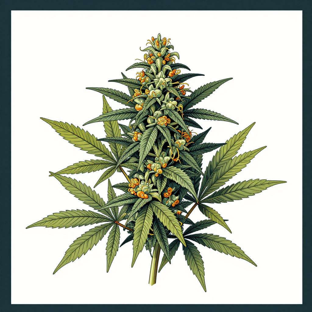 Detailed digital illustration of a cannabis plant with green leaves and small orange buds, centered against a white background.