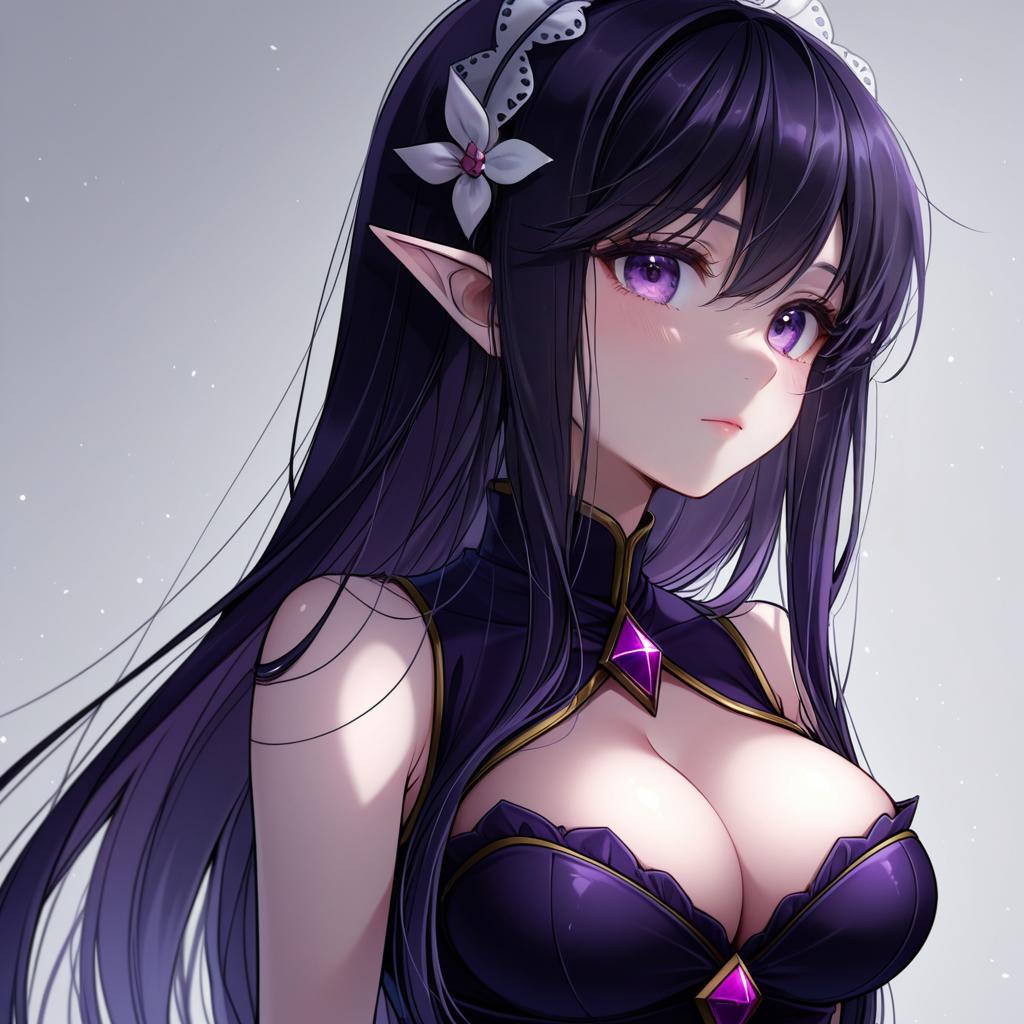 Morgana (league of legends), league of legends, 1girl, pointy ears, purple eyes, long hair, purple hair, black hair, large breasts, cleavage, bare shoulders, by artist kokuchuutei, dark_illustrious
