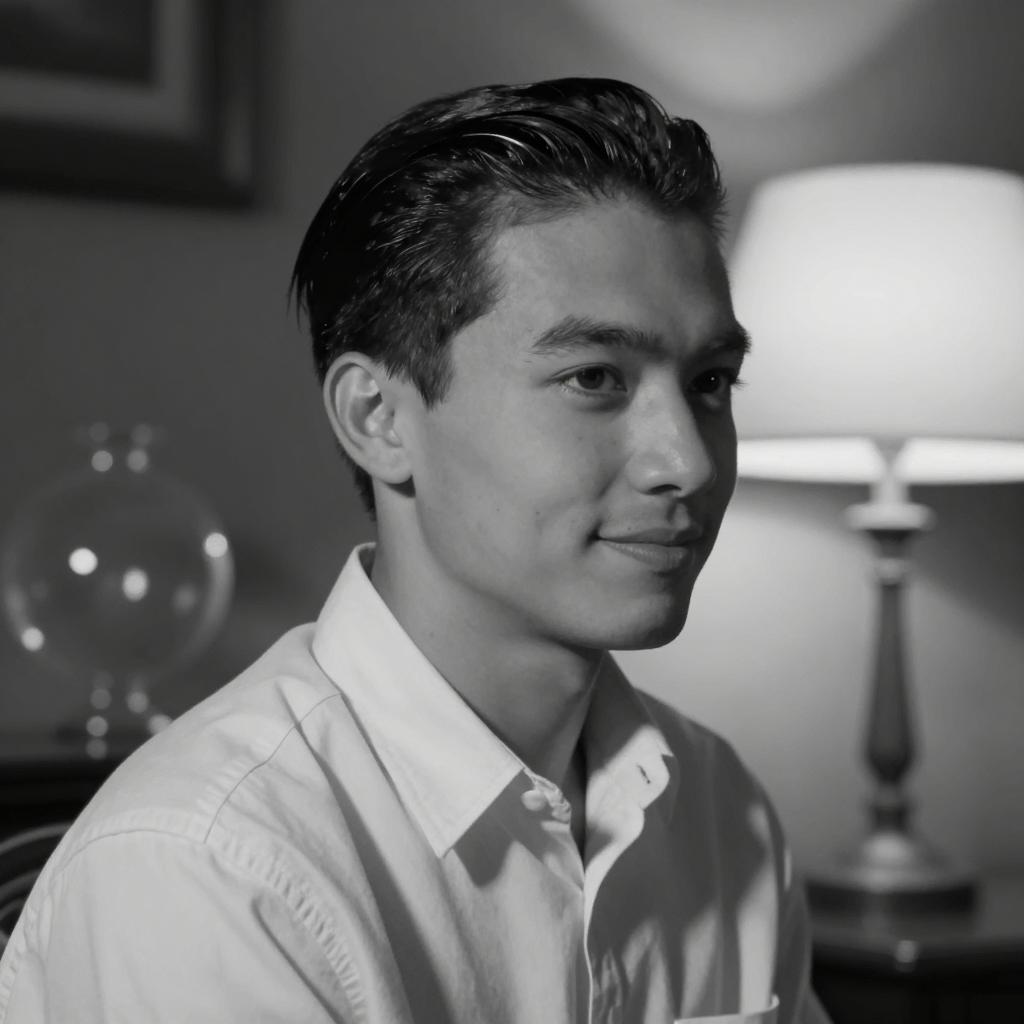Black-and-white photo of two men in a restaurant setting. The man facing the camera has dark hair, is wearing a white dress shirt, dark tie, and wristwatch, and smiles with arms crossed. The second man is seen from behind, blurred. The table has a glass of water and a bottle, with a wood-paneled wall background.