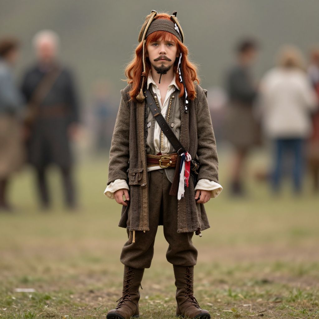 Photograph of a young child with long red hair and a beard, dressed as a pirate. The child wears a brown, textured coat, black pants, brown boots, and a black hat with a white and black pirate emblem. A black sash with a white feather is tied around the chest. The background is blurred, showing an outdoor setting with several indistinct people and greenery. The child stands confidently in the foreground on grass, with a slight dirt path beneath. The overall color palette includes earthy tones, with the child's red hair providing a striking contrast.
