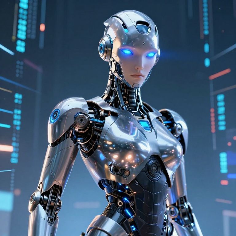 Anition sci-fi character portrait of a highly advanced android with intricate mechanical details, reflective metallic surfaces, glowing blue eyes, wearing sleek armor standing against a digital data stream background with dynamic light effects.