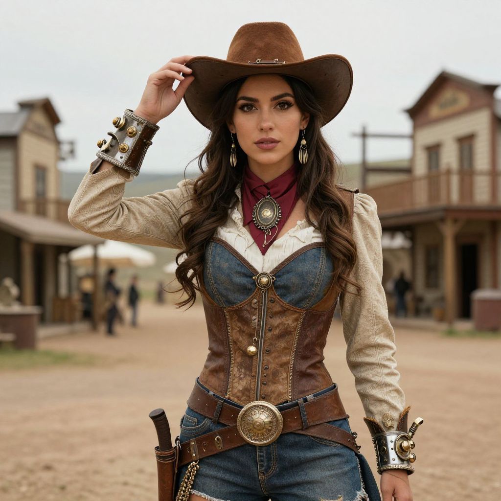 This captivating image showcases a confident woman dressed in a stylish steampunk-inspired outfit, complete with a cowboy hat and intricate accessories. Set against a backdrop of a charming western town, she embodies the spirit of adventure and creativity in a fusion of classic western and fantastical elements.