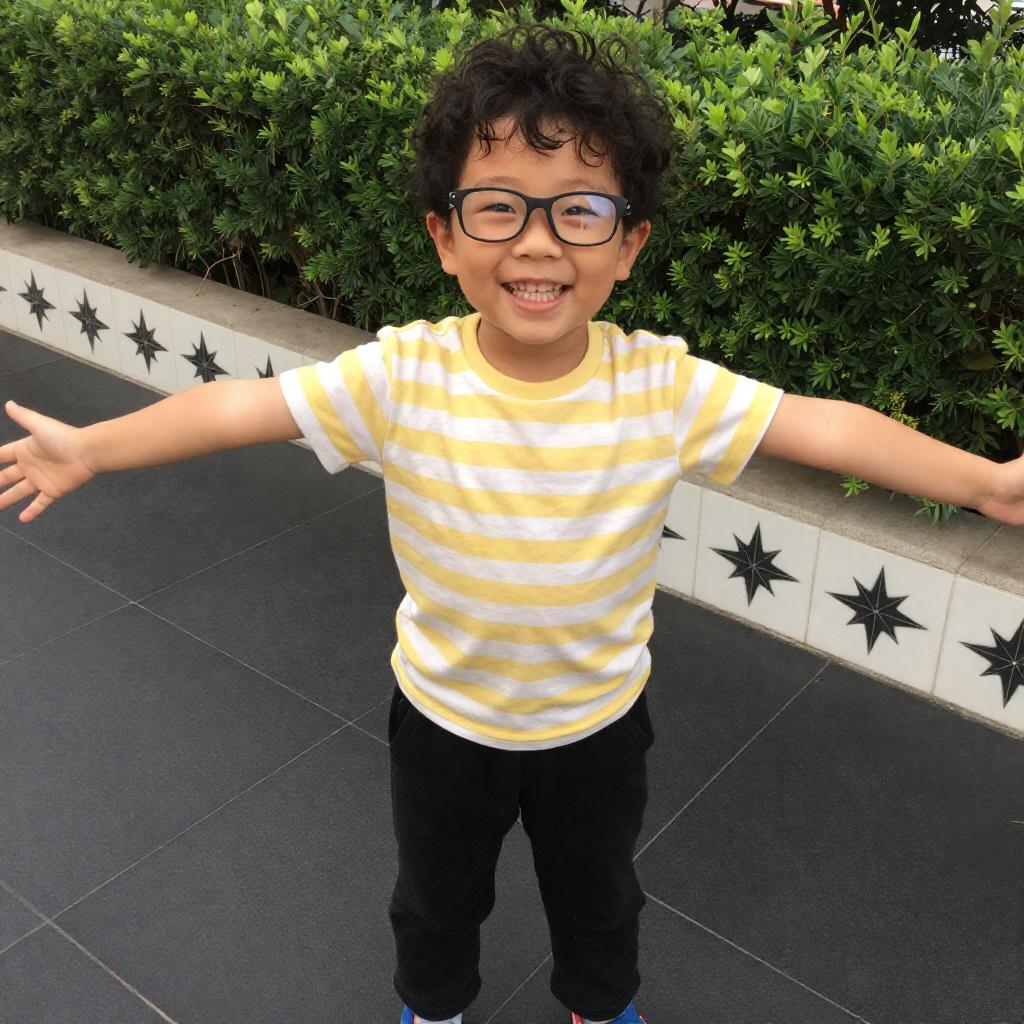 Photograph of a young Asian boy with curly black hair and glasses, wearing a yellow and white striped shirt and black pants. He stands on a black tiled sidewalk with outstretched arms, smiling widely. Behind him, a green hedge and white star-shaped tiles are visible.