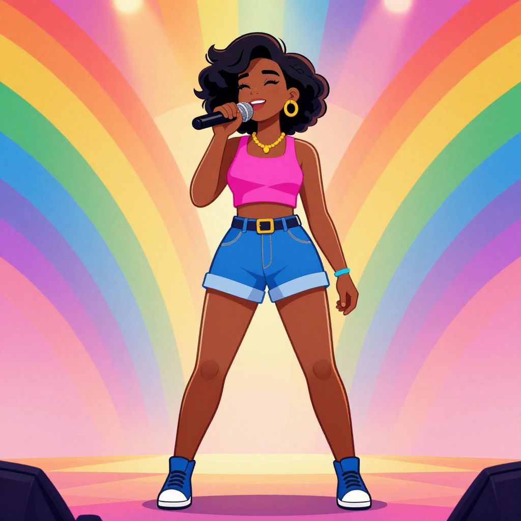 Digital illustration of a confident black woman with curly hair, wearing a pink crop top, blue shorts, blue sneakers, and gold jewelry, singing into a