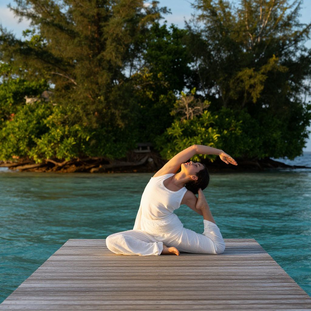 A photograph of a person in a white flowing outfit doing a yoga stretch on a wooden pier extending into a turquoise ocean. The person is seated with one arm extended upward and the other arm stretched out behind, creating an elegant, elongated pose. Dense green trees form a lush island in the background, bathed in warm evening light. The pier's wooden texture contrasts with the smooth water.