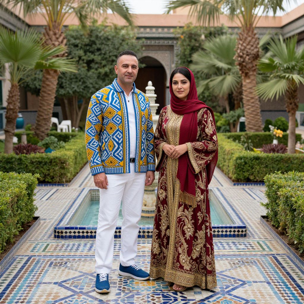 In this stunning image, a man and a woman stand side by side in a beautifully arranged riad garden, exuding the essence of traditional Moroccan royalty. The man, dressed in a vibrant jacket adorned with geometric patterns in shades of blue, yellow, and white, pairs his attire with white pants and blue sneakers. His companion, the woman, is elegantly clad in a long, flowing dress with intricate red and gold patterns, complemented by a red headscarf that adds a touch of warmth to her ensemble. Both are positioned on a patterned tile floor that mirrors the geometric design of the garden, enhancing the visual harmony of the scene. The background features a serene fountain, framed by lush greenery and tall palm trees, creating a tranquil atmosphere. The overall composition, with its rich colors, intricate patterns, and soft lighting, evokes a sense of luxury and tradition, capturing the essence of Marrakesh, Fez, and Zellige tiles in a hyper-realistic, 8K resolution.