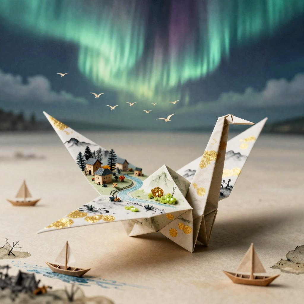 A surreal artwork depicting a monumental origami crane formed from layered paper panels, its unfolding wings revealing entire miniature ecosystems, showcasing tiny folded-village neighborhoods, ink-drawn rivers running through creased valleys, gilded bioluminescent moss, paper-sailboats in paper-canals, and swarms of fluttering miniature paper birds, in a boundless parchment ocean beneath a shifting kaleidoscopic aurora with drifting paper-clouds, painted in mixed-media papercraft surrealism with detailed textures, watercolor washes, gold-leaf accents, and soft cinematic lighting, awe-inspiring and imaginative