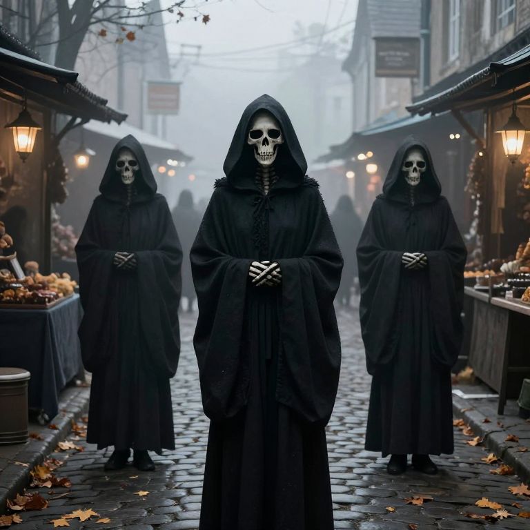Silent figures draped in hooded cloaks stand solemnly in a foggy marketplace, their skeletal faces and hollow eyes reflecting an otherworldly stillness as they navigate the cobblestone streets lined with dimly lit shops and scattered autumn leaves.
