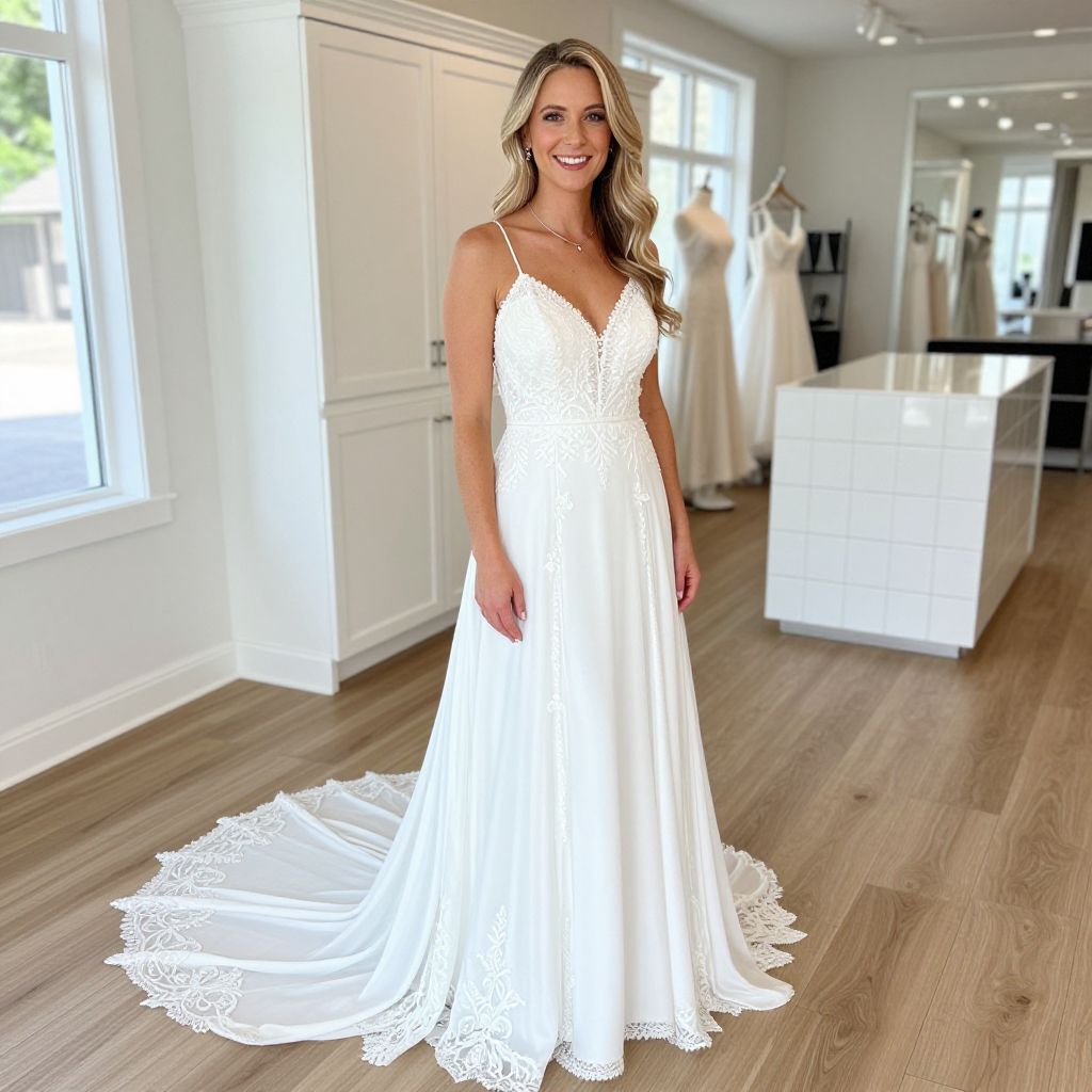 A photograph of a smiling woman with long blonde hair, wearing a white, spaghetti-strap, lace-trimmed wedding dress with a flowing skirt. She's standing in a bright, modern bridal boutique with wooden floors, white cabinets, and large windows. A dress mannequin and a white, tiled island are in the background. Natural light filters in, highlighting the room's clean, minimalist design.
