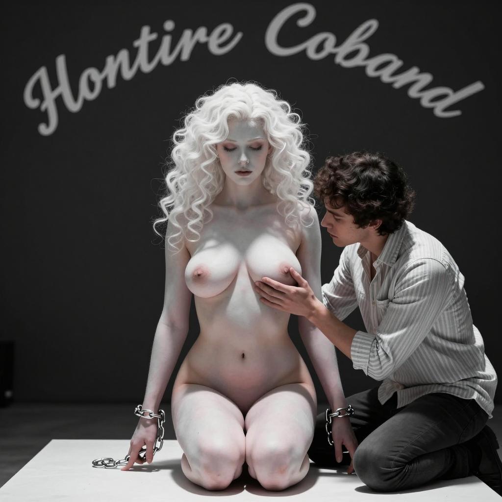 A nude, pale-skinned woman with exaggerated, curly white hair and large breasts, kneeling on a table. Her wrists are chained to the table. A man with dark hair, wearing a striped shirt, kneels beside her, touching her left breast. Dark background with white, cursive arched overhead. Bright light highlights the woman's body, casting shadows.
