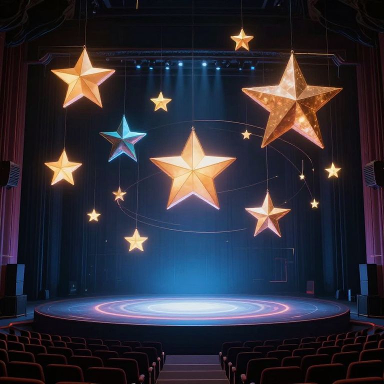 A mesmerizing 3D-rendered scene depicts a futuristic theater where artificial stars, illuminated with a cyberpunk aesthetic, orbit a luminous stage, creating a dramatic visual effect as gravity defies expectations, drawing the audience into a surreal, high-definition spectacle inspired by ancient myths.