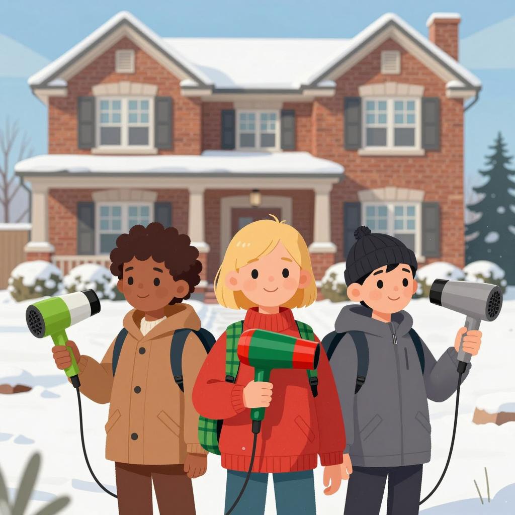 Young red-haired boy wearing a red knit sweater and green plaid sash holding a green and a red hairdryer. Two men stand behind him in winter jackets and beanies, each holding a hairdryer. They are outdoors in front of a large two-story brick house with snow on the ground and a clear blue sky.
