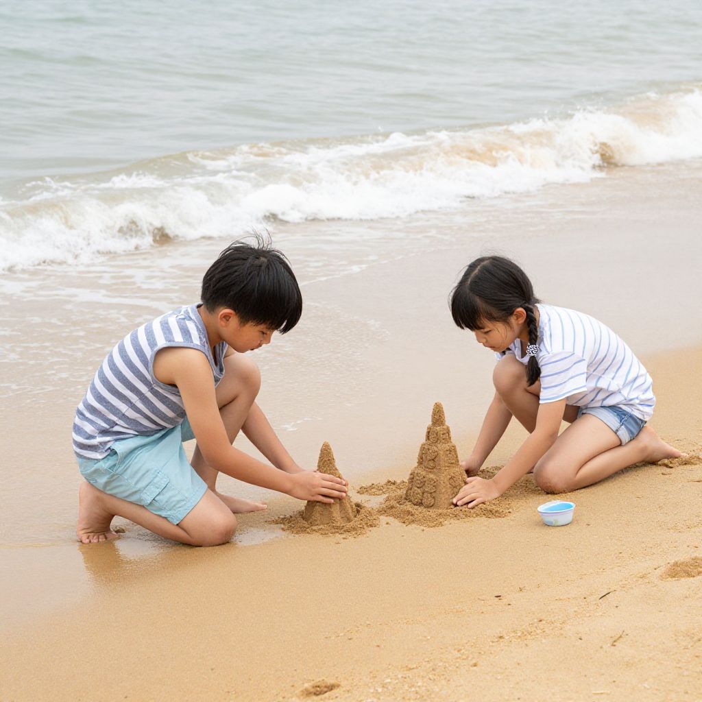 Two children kneel in the golden sand, their hands sculpting towers of memory amidst the ebb and flow of waves, where the whispers of the sea intertwine with the innocence of play, weaving a tapestry of timeless joy and fleeting moments.